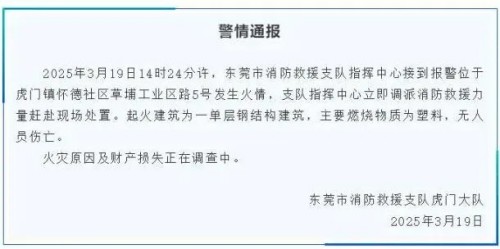 東莞市消防救援支隊(duì)通報(bào)稱,起火建筑為鋼混結(jié)構(gòu)廠房,燃燒物質(zhì)以工業(yè)材料為主,暫未發(fā)現(xiàn)易燃易爆物,這或是火勢(shì)未進(jìn)一步擴(kuò)散的關(guān)鍵原因。